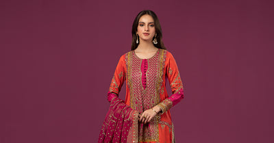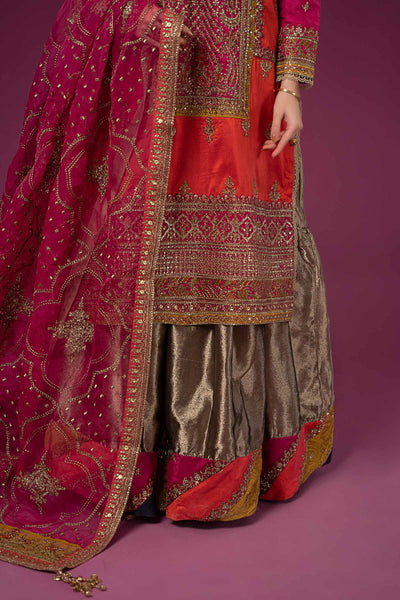 Adorned in multi palettes, our three-piece embroidered raw silk suit is a tribute to our eastern roots, weaving the tapestry of tradition with thread embroidery elevated with dainty sequins and tilla detailing. This timeless beauty features an artsy blend of indigenous bottis, paisleys and tribal elements that epitomizes classic understated sophistication. It is is offset by a gharara, emblazoned with chatta-patti embroidered hem and a majestic embroidered dupatta, framed by festoon and classical elements that create a mesmerizing composition with sequins and tilla embroidery, making it a statement choice for all your soirees.