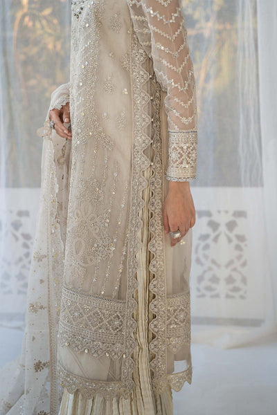 Dive into enchantment with our three-piece embroidered organza suit that unfolds in a soft beige canvas, adorned with an array of meticulously crafted classical and floral embroideries, seamlessly blending into tonal shades, creating mesmerizing artistry with shimmering sequins, tilla, and ornamental detailing. This masterpiece is further elevated by the inclusion of a scalloped border dupatta graced with delicate sequins and tilla embroidery and crushed dhaka trousers detailed with culminating in organza hem design, allowing you to evoke a dream-like aura during your festivities.