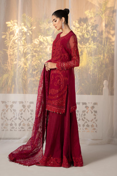 Capturing the essence of enduring beauty with our three-piece embroidered chiffon suit - A teal-hued masterpiece weaving enchanting festoons with intricate sequins & thread embroidery clad with exquisite panni work. Adding to its allure is an elaborate sequin embroidered dupatta accented with panni work and a dyed gharara framed with sequins embroidery and panni work, allowing you to create ever-lasting looks during your summer festivities.