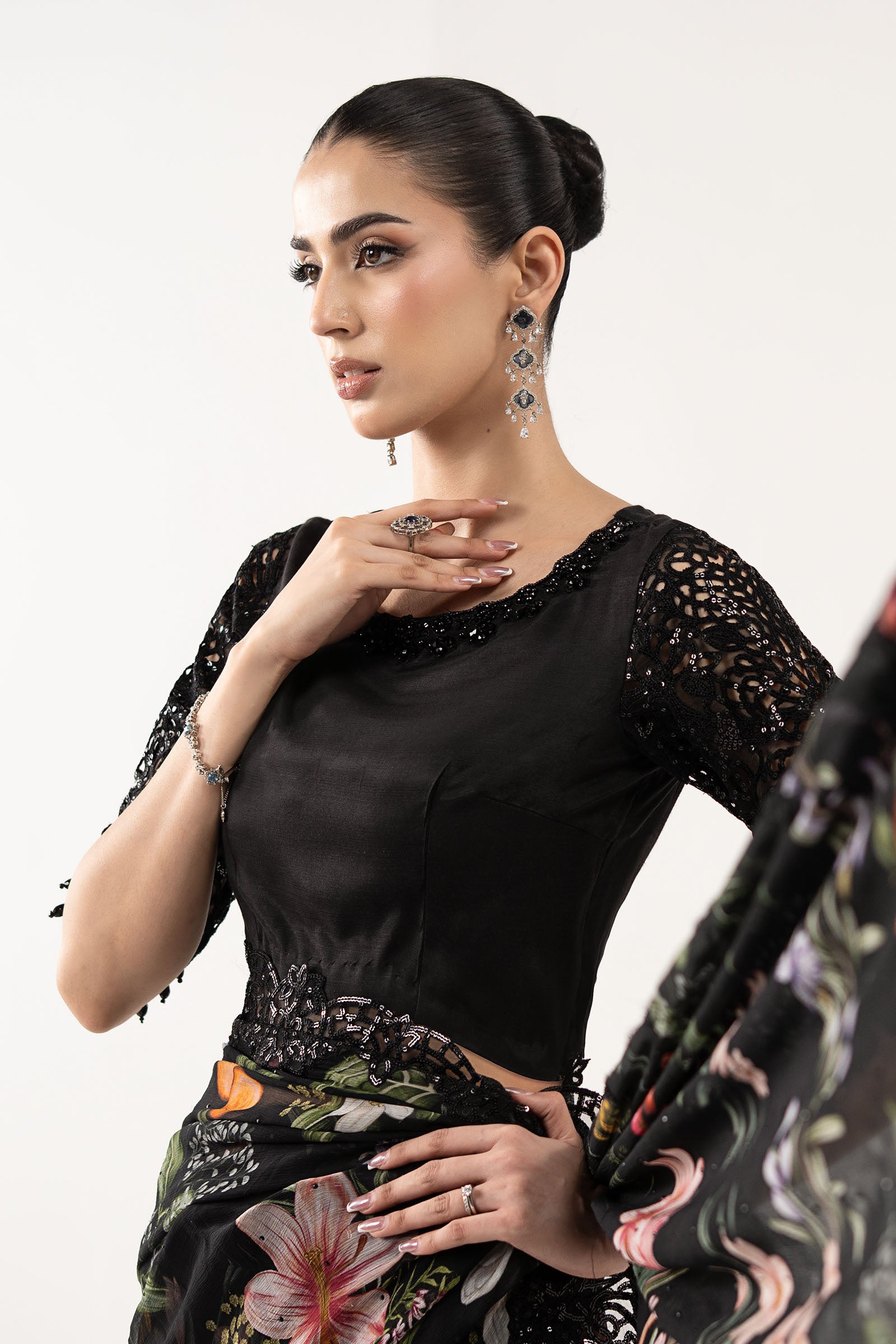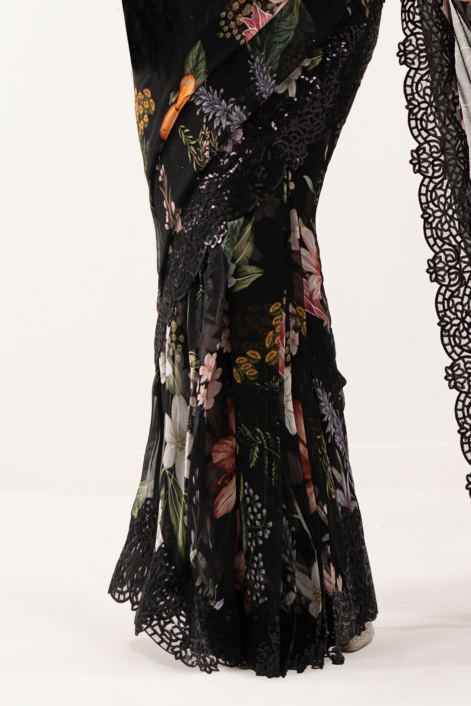 BlouseHand-Embellished NecklineEmbroidered Sleeves With Crystal Drop DetailingHidden Side ZipColor: BlackFabric: Raw Silk SareePrinted Saree With Spray EmbroiderySequin-Embellished BorderColor: BlackFabric: ChiffonPetticoatDyed PetticoatDrawstring WaistColor: BlackFabric: Raw SilkWork Details: Sequin & Thread EmbroideryModel is wearing xs sizeNote: Dry Clean Only