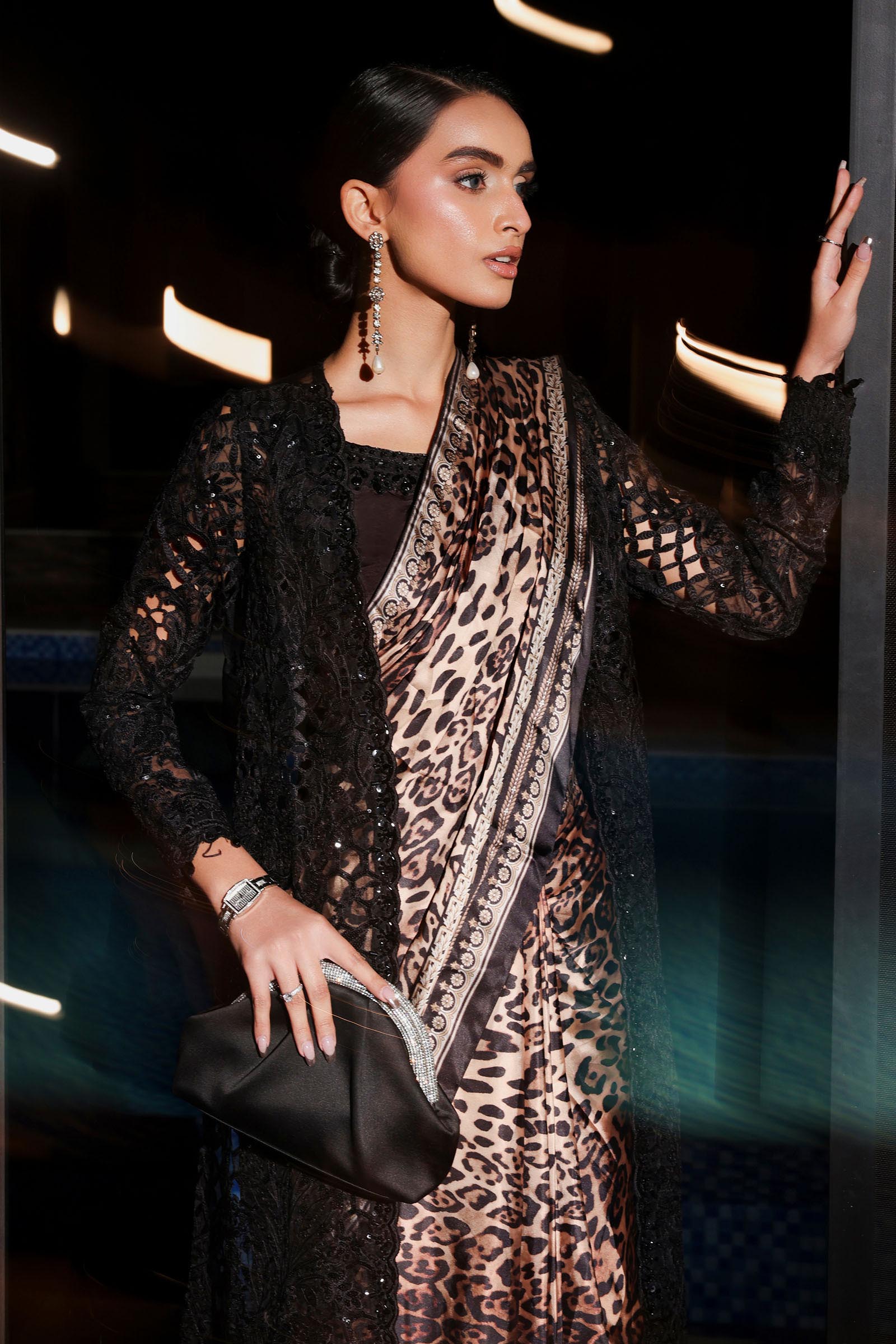 BlouseSleeveless BlouseHand-Embellished NecklineSide Hidden ZipCotton Satin Lining AttachedColor: BlackFabric: Raw SilkJacketEmbroidered Hand-Embellished Front-Open JacketEmbroidered Straight SleevesCrystal Drop Detailing On Sleeves & BorderColor: BlackFabric: OrganzaSareePrinted SareeHook Closure On WaistbandFit: RegularColor: Brown & BlackFabric: Satin SilkPetticoatDyed PetticoatDrawstring On WaistColor: BlackFabric: Raw SilkWork Details: Sequin & Thread EmbroideryModel is wearing xs sizeNote: Dry Clean Only