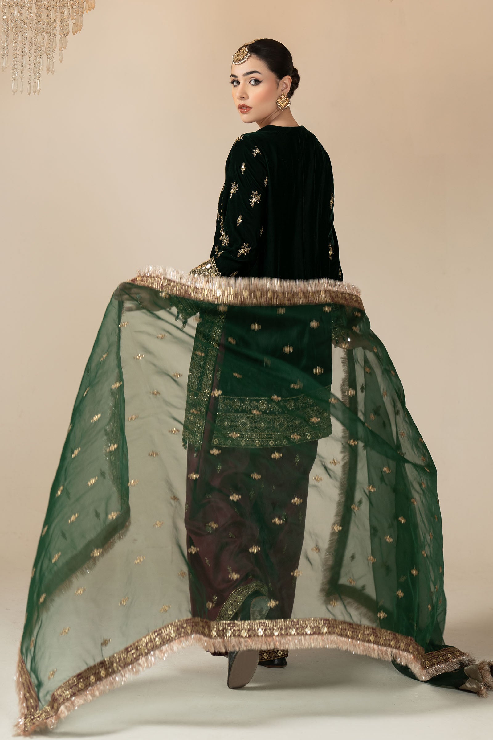 ShirtHand-Embellished Embroidered NecklineBlock-Printed Front With Spray EmbroideryGotta Lace Detailing On PanelsEmbroidered Side Seams & BorderFull-Sleeves With Embroidered BorderBlock-Printed BackFit: RegularColor: GreenFabric: VelvetGhararaDyed GhararaElasticated WaistbandCrushed Flare With Embroidered HemFit: RegularColor: PinkFabric: Raw SilkDupattaEmbroidered DupattaFour-Side Embroidered Border With Gotta Lace DetailingColor: Light CopperFabric: Zari NetWork Details: Sequins, Tilla & Thread Embroidery Model is wearing xs sizeNote: Dry Clean Only