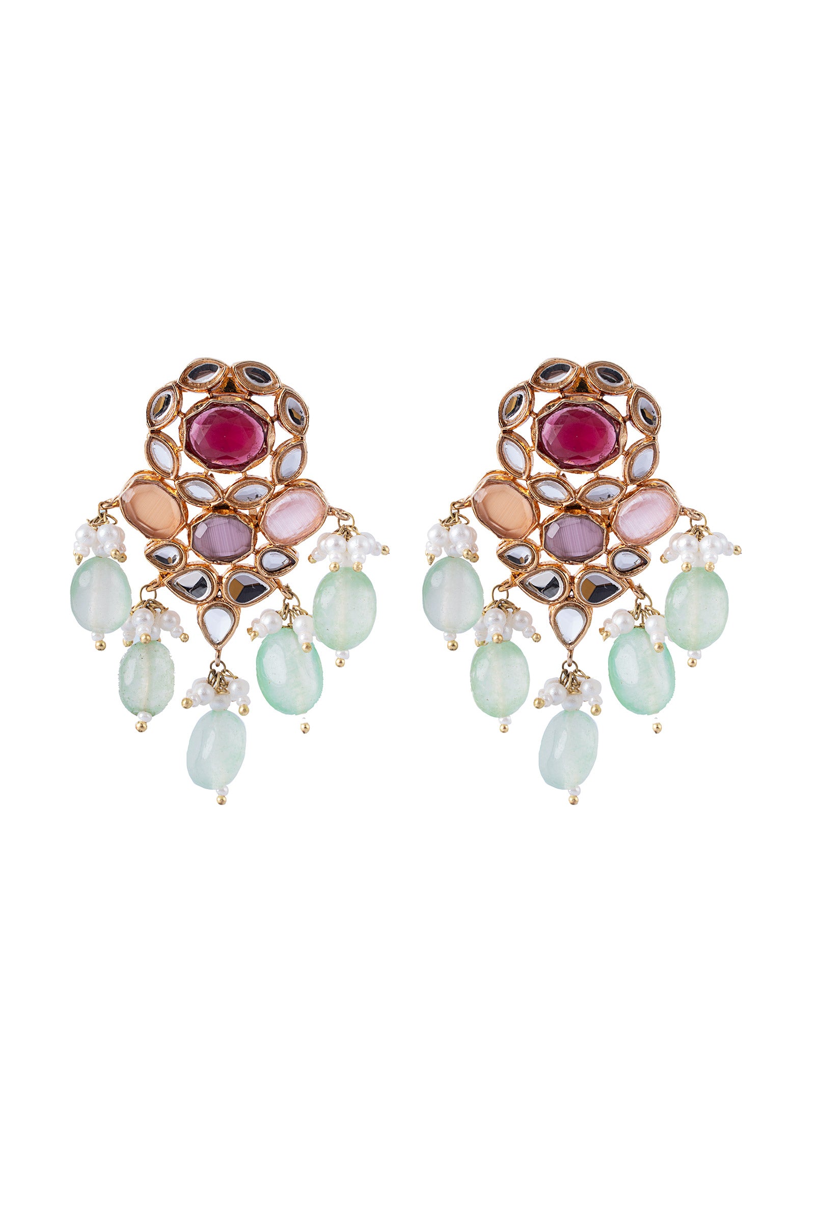 Illuminate your festivities with our Sirin 2Pc Necklace and Earrings Set - Crafted intricately with handcut glass, and multi-color cat's eye stones and finished with hanging jade green beads with the artistry of Indian poth pyroi. This masterpiece is perfect for adding sophistication and grace to your festive style. Finish: 21K Gold Plated Product Care: Wipe Clean