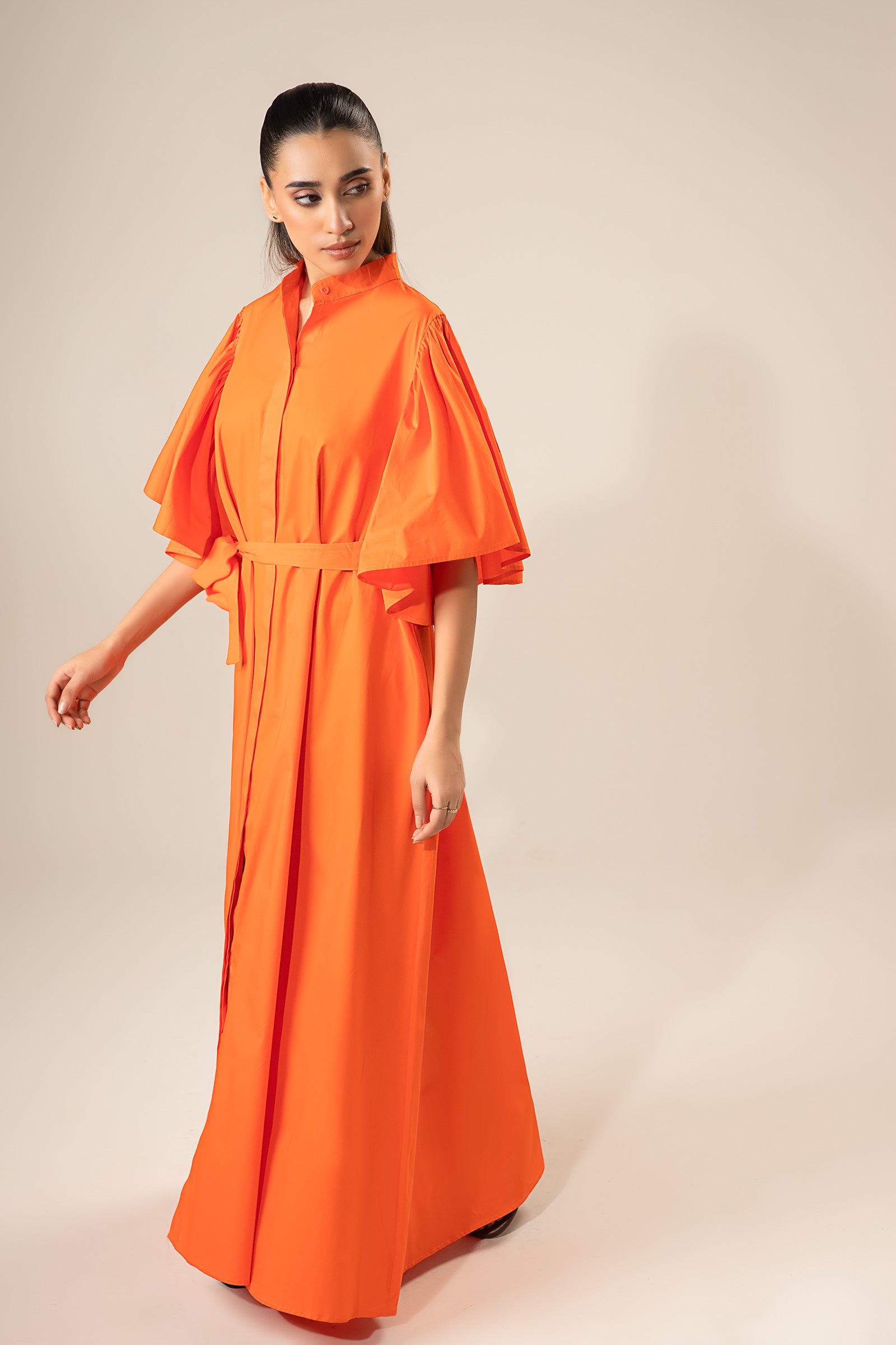 Details: Long Button Down Dress With Flutter Sleeves & Belt Material: Blended Cotton Color: Orange Stretch: None Fit: Free Size Note Dry Clean Only Do Not Bleach Iron On Medium Heat Settings