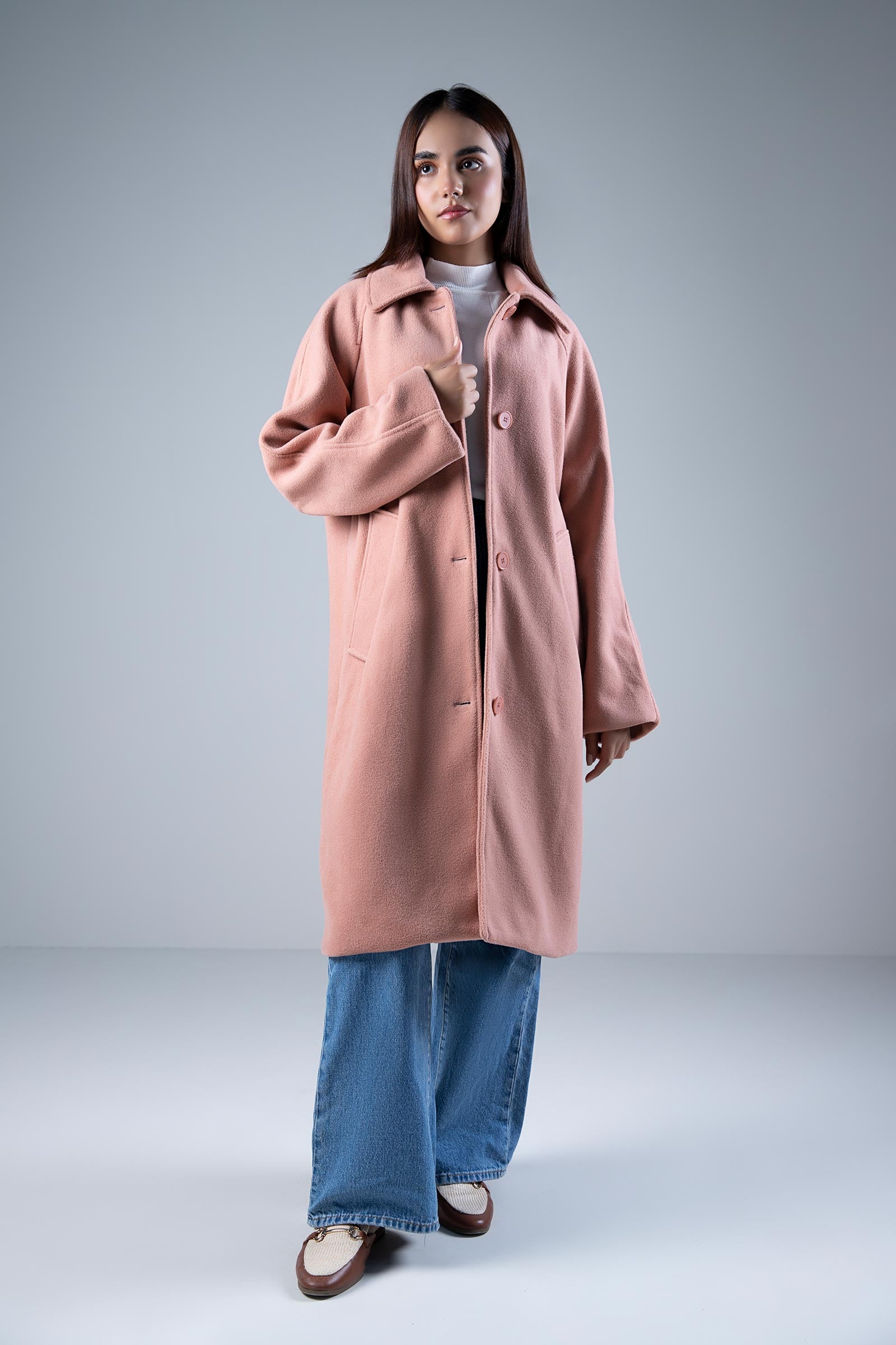 Mid Length Full Sleeve Wool Coat With Two Front Side Pockets & Buttoned Fastening Material: Blended Wool Color: Tea Pink Stretch: None Fit: Relaxed Size: The model is wearing size xs Note Dry Clean Only Do Not Bleach Iron On Medium Heat Settings