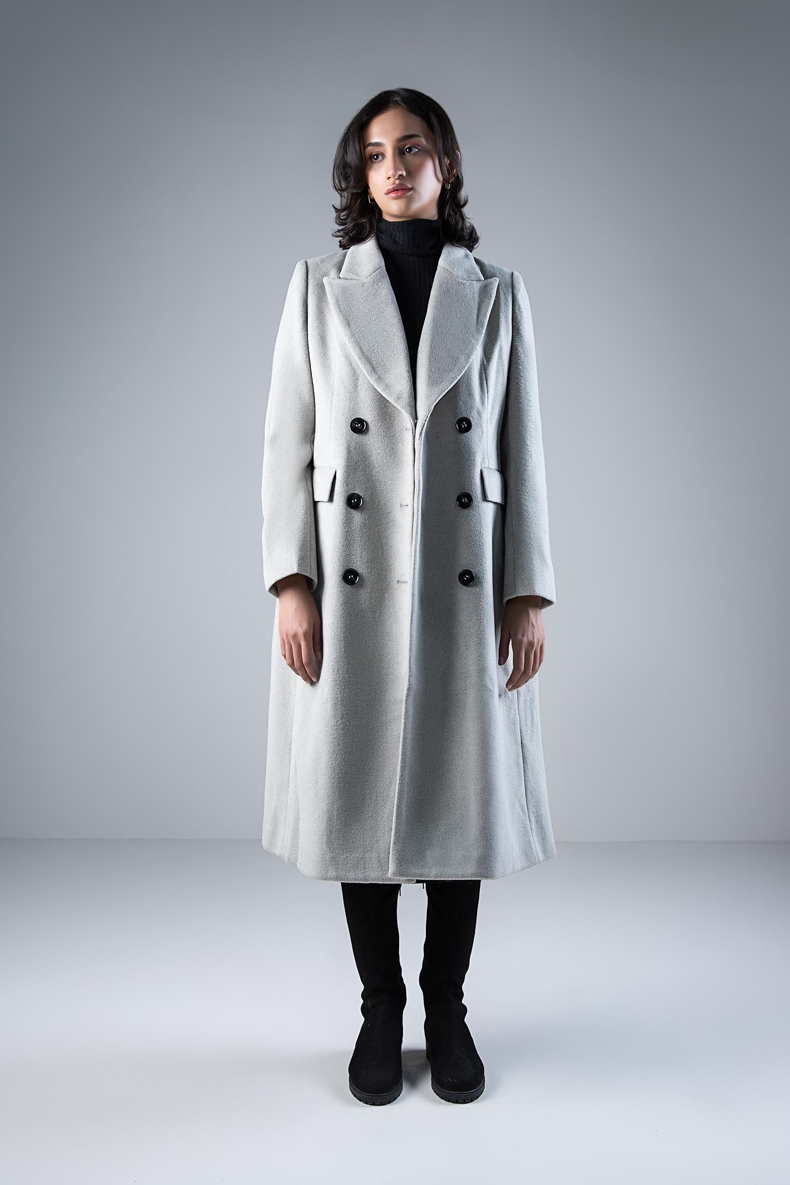 Full-Length Double Breasted Coat With Two Fake Front Pockets, Back Slit & Buttoned Fastening Material: Blended Wool Lining: Satin Color: Grey Stretch: None Fit: Regular Size: The model is wearing size xs Note Dry Clean Only Do Not Bleach Iron On Medium Heat Settings