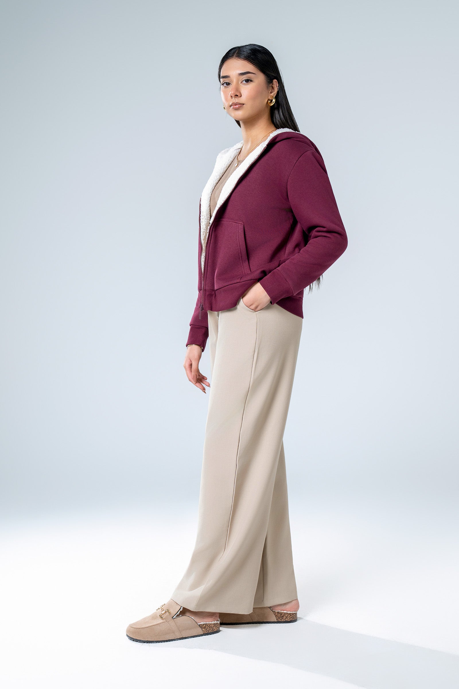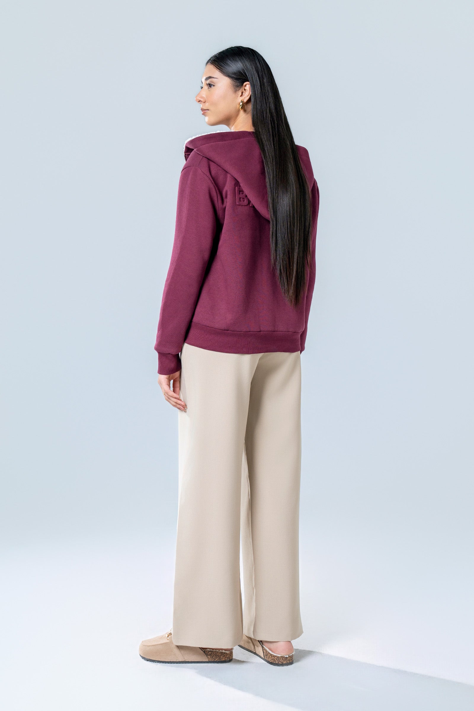 Fleece Hoodie With Zipper Opening, Long Sleeves, Sherpa Lining & Embossed Back LogoHoodie Material: FleeceLining Material: SherpaColor: MaroonStretch: HighFit Type: RelaxedAvailable in XS, S, M & L SizeNoteDry Clean OnlyDo Not BleachDo Not Iron