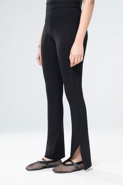 Flared Pants With Waistband, Side Zipper Opening, Welt Pockets & Side Slits.