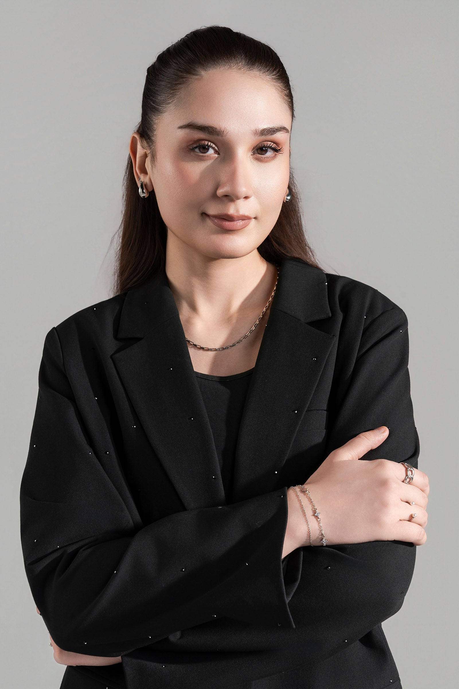 Embellished Blazer With Front Flap Pockets, Notch Collar, Regular Shoulders & Long Sleeves.Material: TwillLining: PolyesterColor: BlackStretch: NoneFit Type: RegularAvailable in XS, S, M & L SizeNoteDry Clean OnlyDo Not BleachIron on Medium Heat