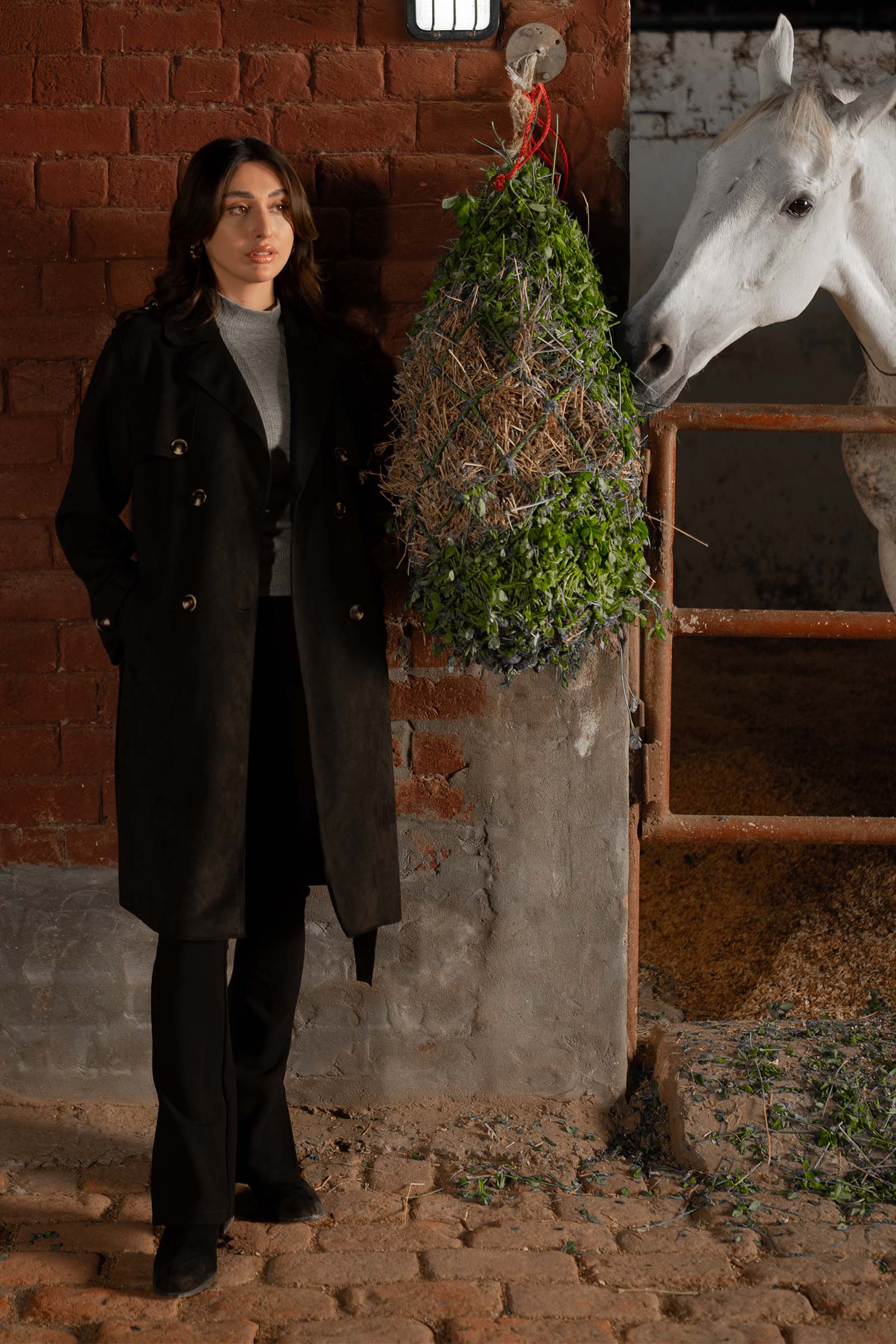 Mid-Length Double Breasted Coat With Two Front Side Pockets, Back Vent & Buttoned FasteningMaterial: SuedeLining: SatinColor: BlackStretch: NoneFit: RelaxedAvailable in S, M & L SizeNoteDry Clean OnlyDo Not BleachIron on Medium Heat