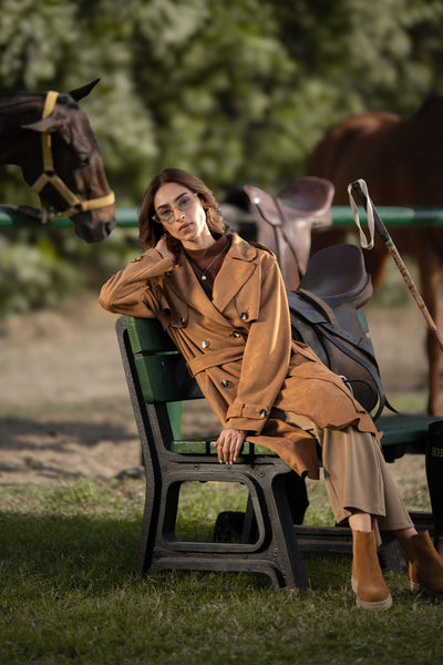 Mid-Length Double Breasted Coat With Two Front Side Pockets, Back Vent & Buttoned Fastening