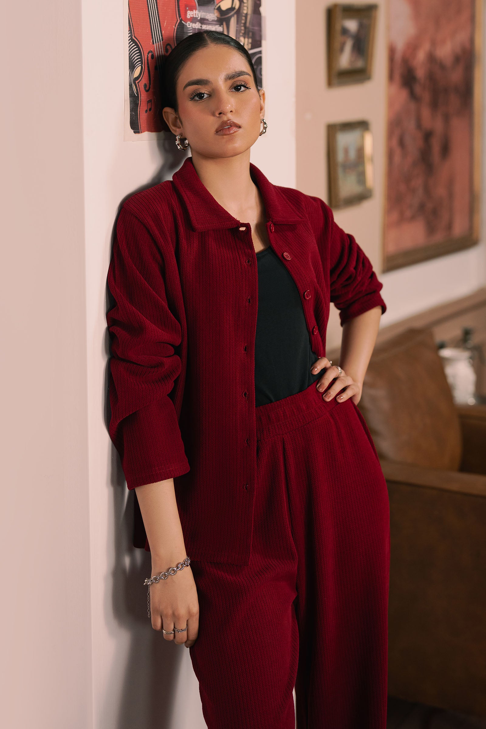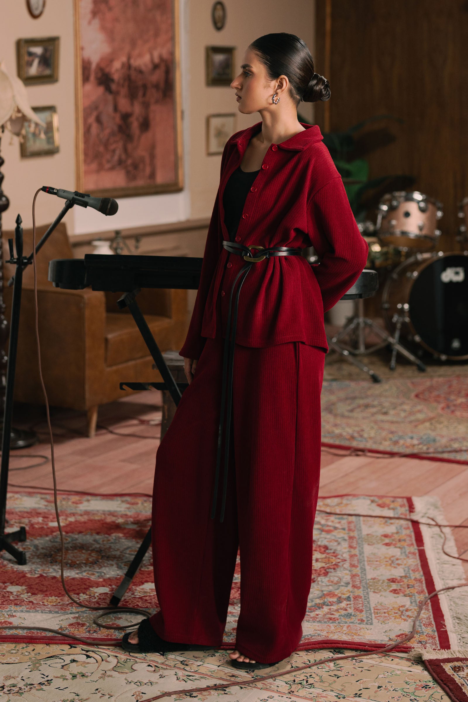 Co-ord Set With Textured Knit Collared Button-Down Long-Sleeve Top Paired With Wide-Leg Pants. Material: Textured Knit Color: Red Stretch: High Fit Type: Relaxed Available in XS, S, M & L Size Note Dry Clean Only Do Not Bleach Do Not Iron