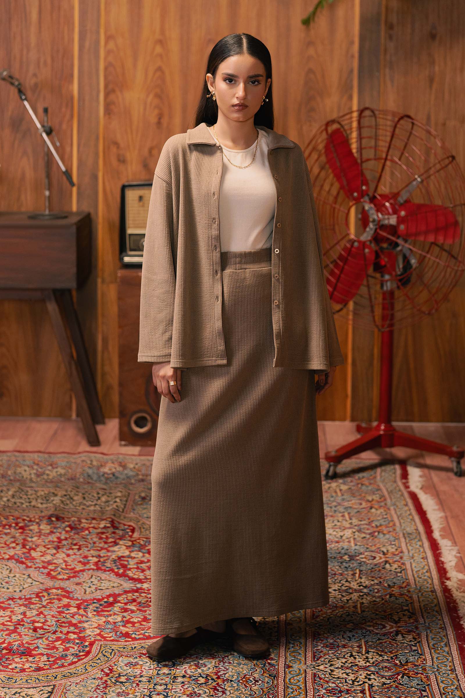 Co-ord Set With Collared Button-Down Long-Sleeve Top In Boxy Fit, Paired With Flared Skirt.