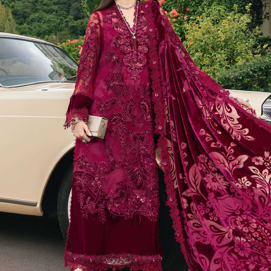 Color: MaroonShirtEmbroidered Velvet Neck PattiEmbroidered Chantilly Front Panels R+L With Velvet Applique, 3D Flowers & PearlsDyed Chantilly Front Side Panels & BackEmbroidered Velvet Ghera Patch With Organza Applique & 3D FlowersEmbroidered Chantilly Sleeves With Velvet AppliqueDyed Velvet Ghera Patti BackUndershirtDyed Linen UndershirtTrouserDyed Linen TrouserDupattaDyed Palachi DupattaNote: Dry Clean Only