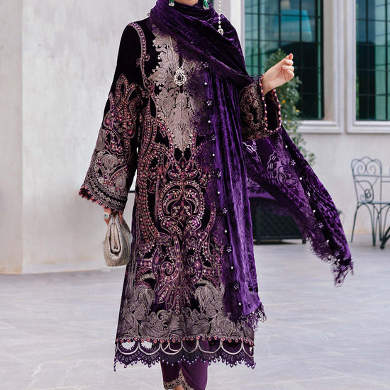 Color: Dark PurpleShirtEmbroidered Velvet Front R+L PanelsEmbroidered Velvet Ghera PatchEmbroidered Velvet SleevesEmbroidered Velvet Sleeves PatchEmbroidered Velvet Pocket PatchDyed Velvet BackTrouserDyed Linen TrouserDupattaDyed Palachi DupattaNote: Dry Clean Only