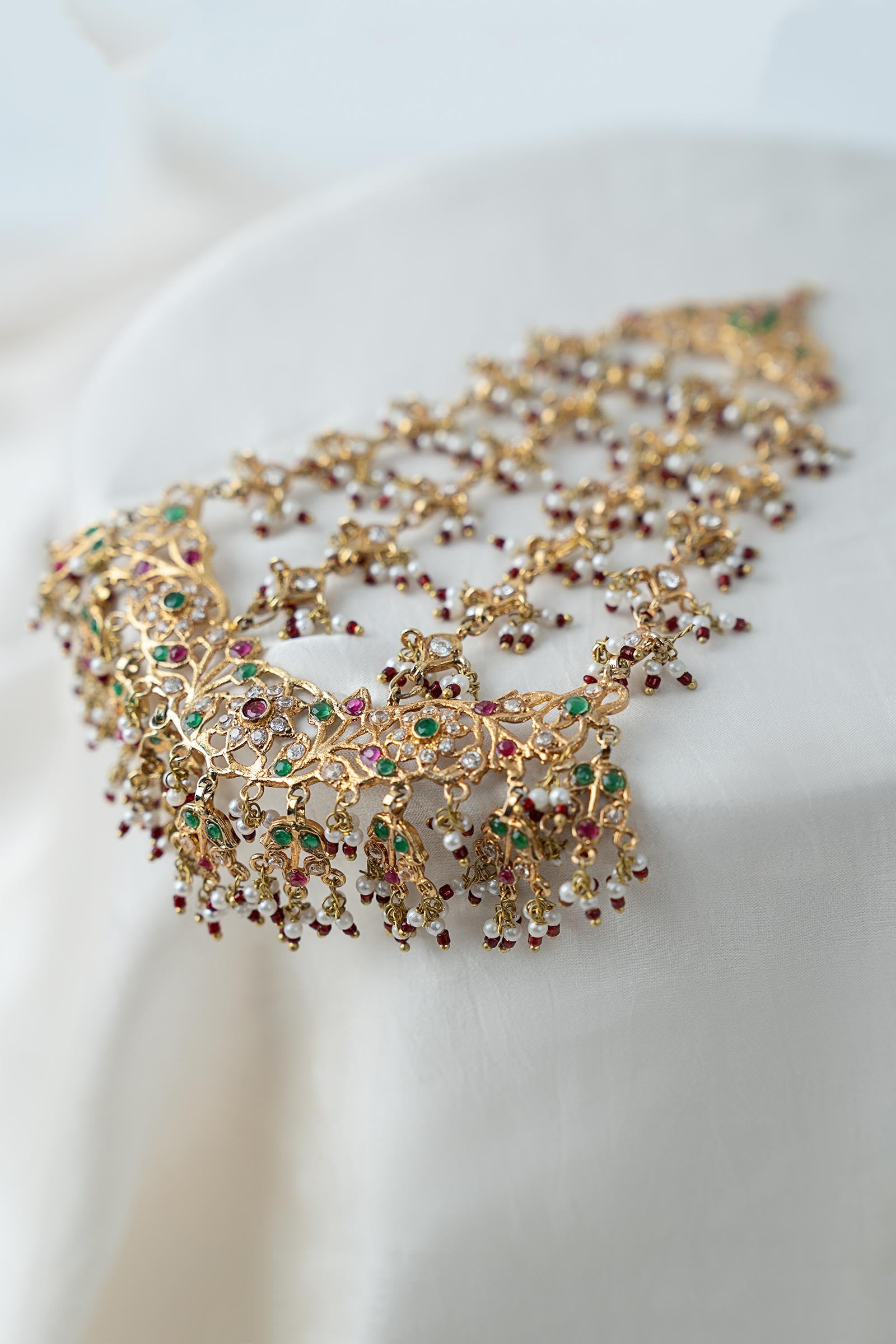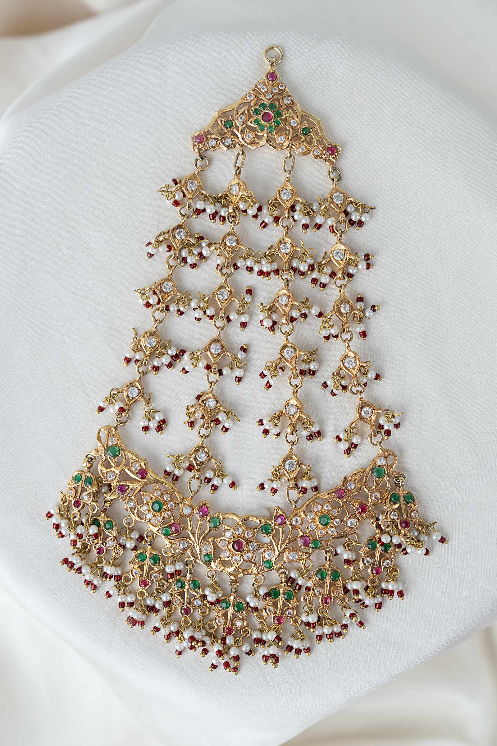 Drenched in festive opulence, this stunning jhoomar is adorned with the soft glow of pink chatham, the deep richness of green onyx, and the radiant sparkle of white zircons. Finished with graceful pearl piroi and a bold touch of red poth, it’s a timeless piece that captures the spirit of celebration with every shimmer and sway. Finish: 21K Gold Plated Product Care: Wipe Clean