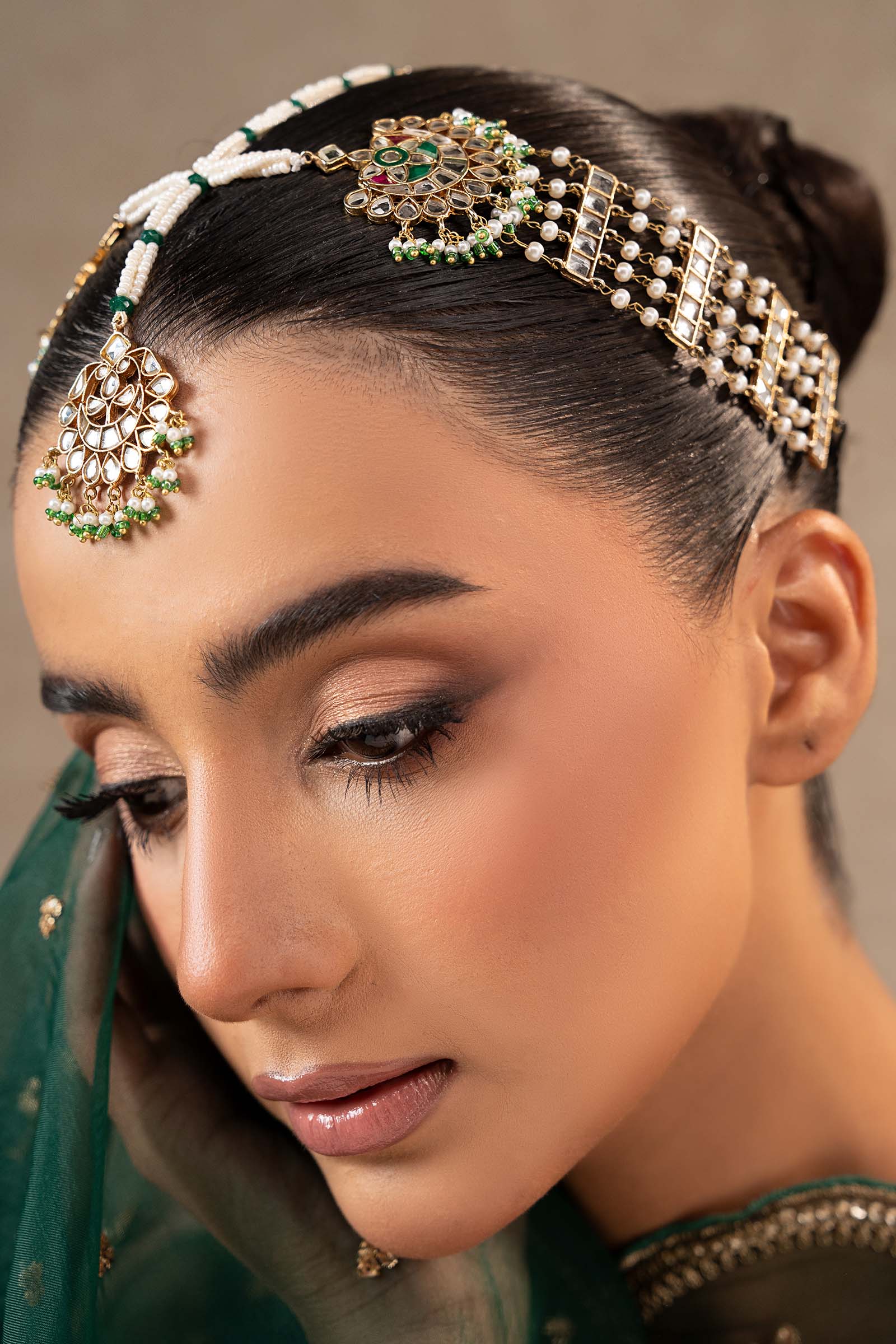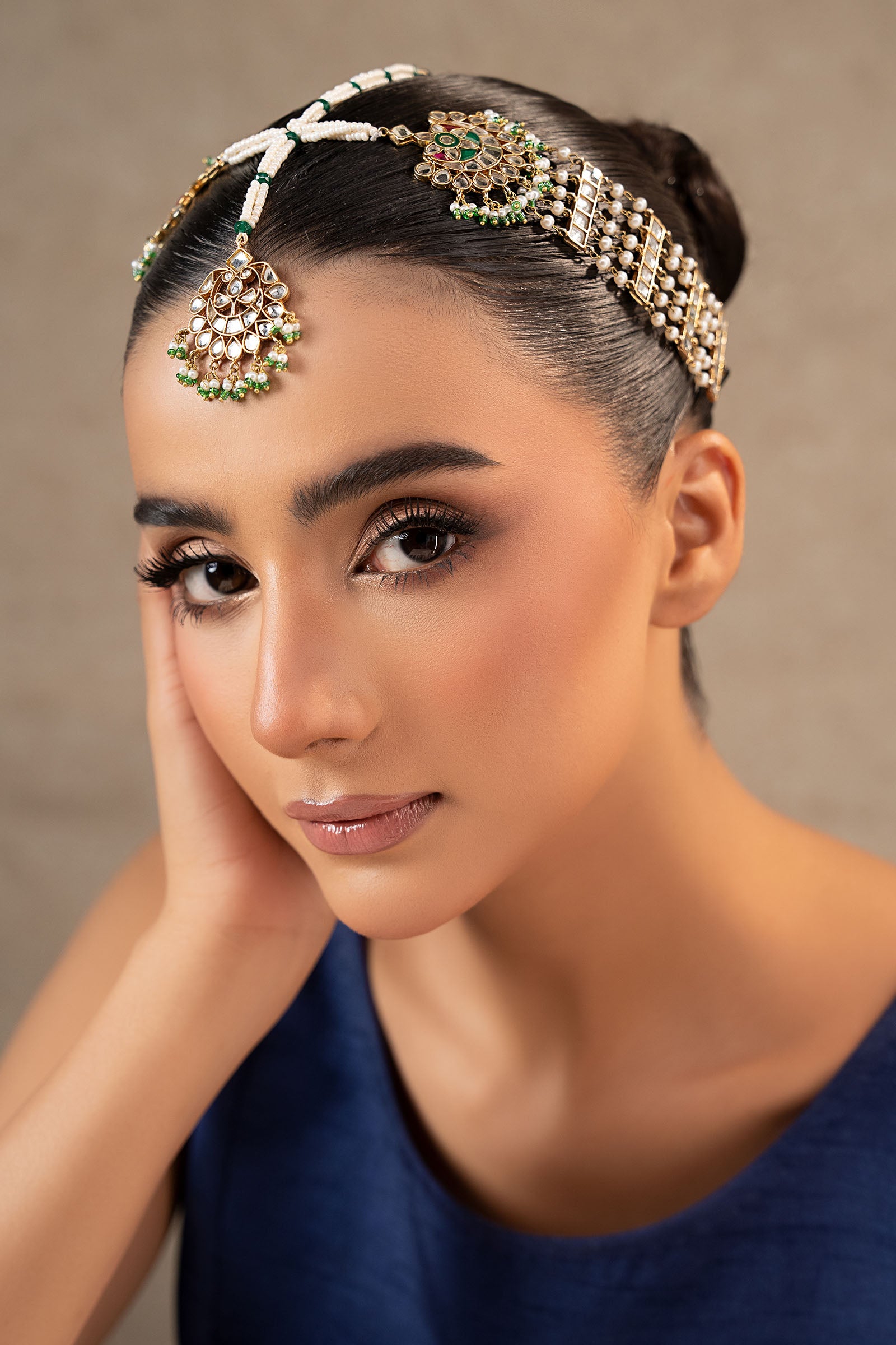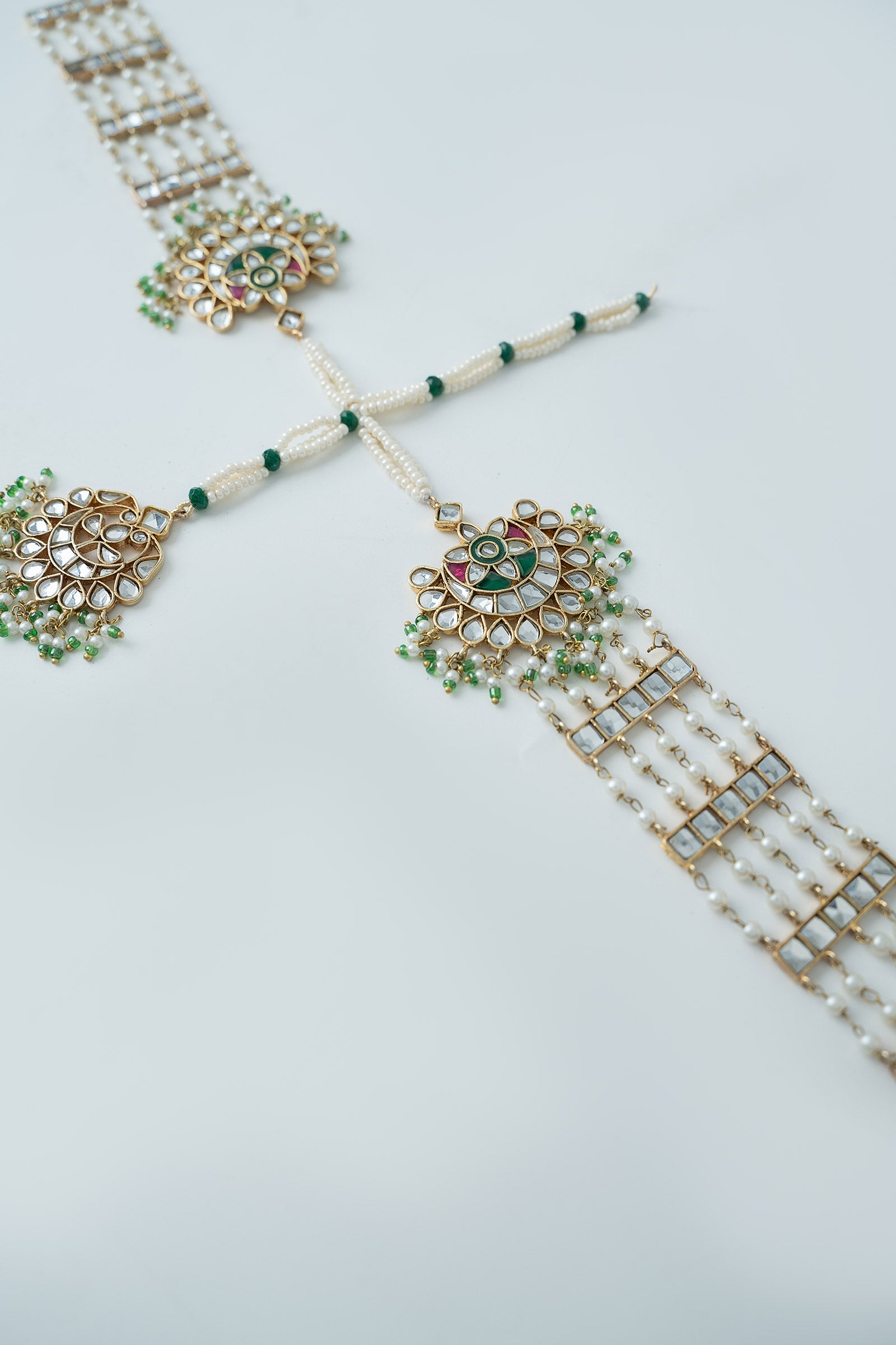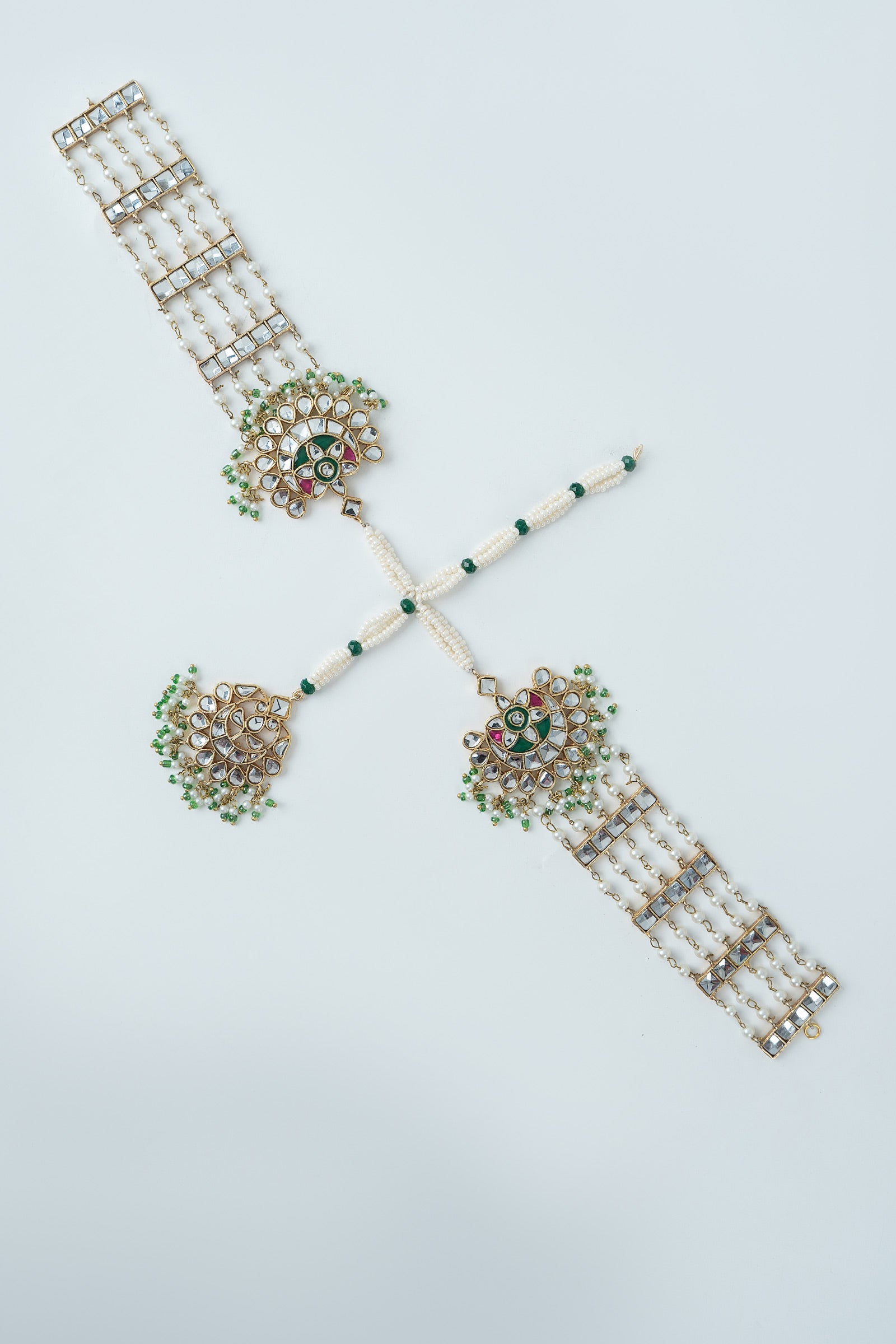 This Matha Patti, a royal crown of heritage, combines the depth of green onyx, the glimmer of white handcut glass, and the blush of pink chatham. With each sparkle, its pearls, green enamel, and subtle Indian poth pyroi convey a timeless elegance and festive grace. Finish: 21K Gold Plated Product Care: Wipe Clean
